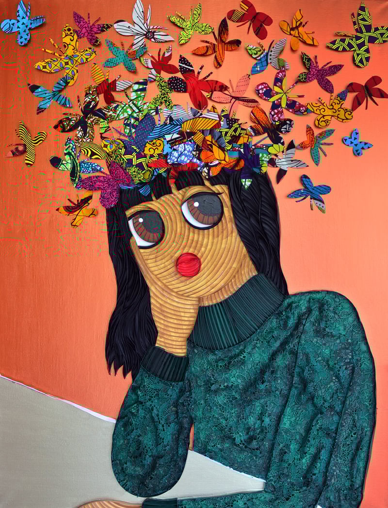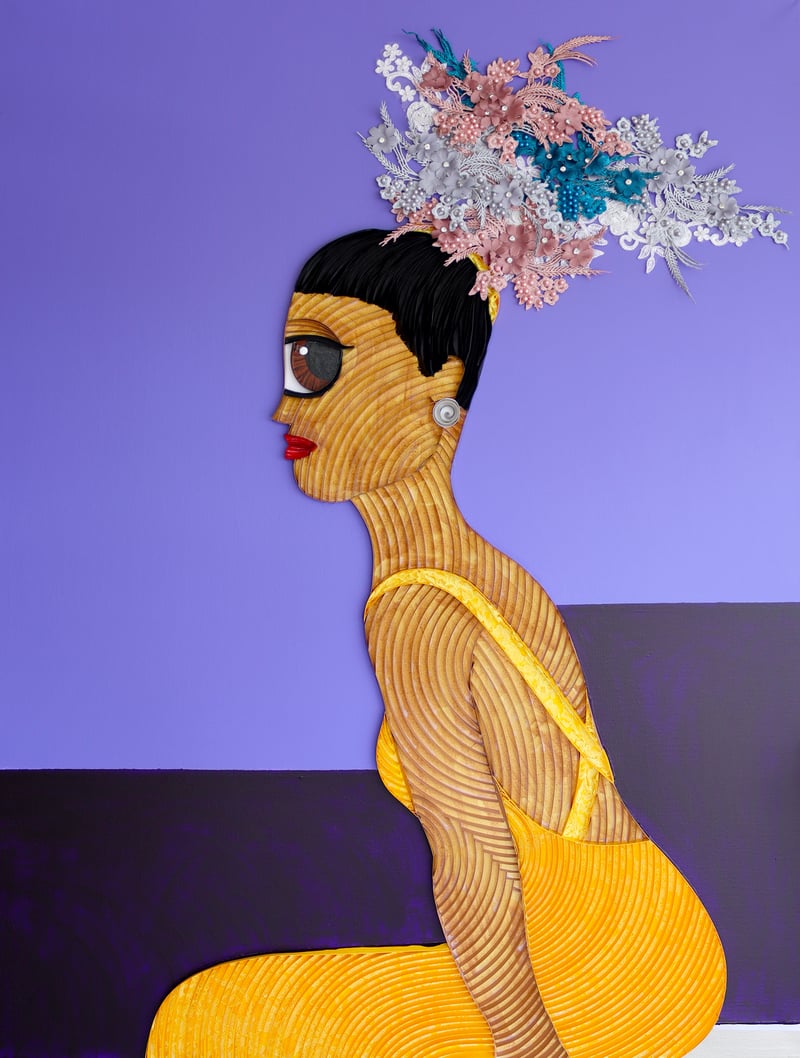 Ayobola Kekere-Ekun (b. 1993, Lagos) is a Nigerian artist working in South Africa. Her practice brings together her interests in advertising, popular culture, gender, portraiture and Nigerian politics. Using a method of paper craft called quilling, she creates seemingly benign images that evoke the frivolities of selfie culture, while referencing gender, mythology, memory, and trauma.