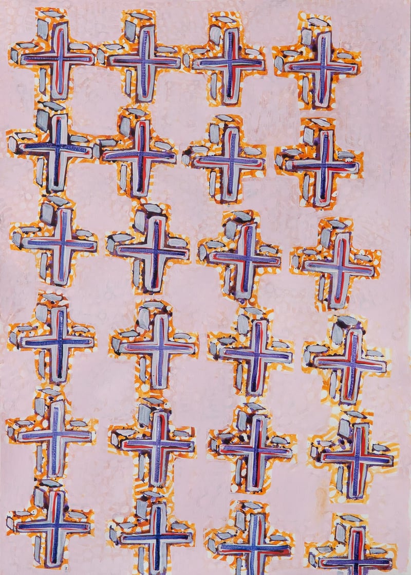 Nicky Marais (b. 1962) is a Namibian artist and educator currently based in the former mining town of Oranjemund in southern Namibia. Having worked for eleven years as the Head of Department of Visual Arts at the College of the Arts in Windhoek, she has been an integral contributor to the development of the Namibian contemporary art scene. Now retired, Marais focuses on her own painting practice, an obsessive and graphically sensitive investigation of what she calls “significant shapes”.